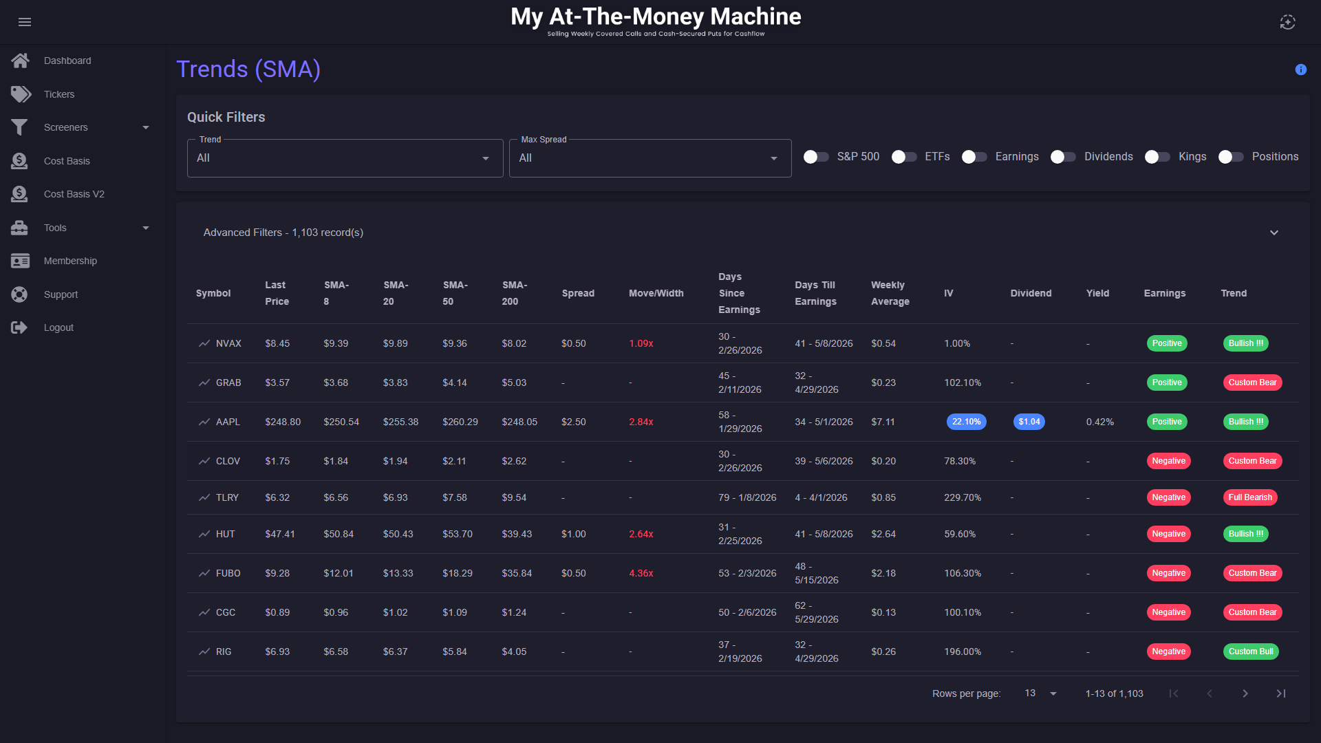 | Avoid earnings announcements | Trends & SMA | Shows days until next earnings - sort to find safest windows |